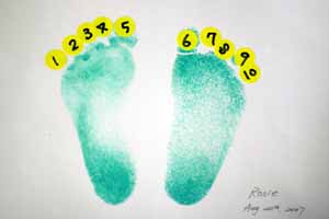 今天遊戲課的時候,老師講完「動物的腳」故事書,就讓大家印自己的腳印。這是Rosie第一個作品。