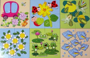 前陣子幫小Rosie買了一整套的拼圖。整組一共20盒,從最淺的兩片一直到32片。前面四盒分別是兩片和三片的,小Rosie大概玩兩三次就搞定了。不過孩子都很喜歡重複性很高的東西。儘管這幾盒對她來說來說很簡單,她還是樂此不疲,每天都要把好幾盒拼圖搬出來玩。我看她玩得差不多了,就開始拿第五盒出來讓她玩。第五盒的難度明顯增加。除了片數從三片變為四片外,圖案開始也變得比較複雜。前四盒的圖案都是一個完整的事物,例如:一輛公車,一個蛋糕。第五盒的圖案開始比較複雜,是好多隻魚,幾隻瓢蟲等。 小Rosie試了兩三次,發現有點困難後,就生氣不玩了。隨後就跑去拿其他簡單的拼圖出來玩。嘿嘿!我早就知道她是個堅持度比較不足的孩子,遇到一點點困難就很容易放棄,所以才會狠下心買一整組拼圖來磨她的耐性。後來趁她睡覺的時候,我把其他簡單的拼圖偷偷收起來。只留下第五盒。隔了兩三天的某一個下午,她吃過點心,心情正好的時候,拿第五盒拼圖出來讓她玩。由於這個拼圖對她來說,真的有點難。所以這次讓她玩得時候,我先把其他三片幫她拼好,剩下一片讓她放。這樣,她只需要思考放的方向,而不需要選擇放哪一片。她用試的,很快地就完成了。當她拼對了,我也試著讓她觀察並告訴她,其中的圖案或線段有連接起來,所以是對的。之後,我試著拿掉其他片拼圖,她也很快的就能正確地拼完。隔天下午,我又拿出拼圖。這次我幫她拼好兩片。剩下兩片讓她拼。現在他必須在剩下兩片拼圖中選擇一張,而且還必須選擇方向。有了這次小Rosie花了比較久的時間,但她後來似乎發展出自己的方法。她先拿其中一片,兩個方向都試拼看看,都不行就換一片。當她有固定的方法以後,她就很快地拼出來了。這個方法連我也沒有想到,但她卻能從操作中發展出解決問題的程序與方法。同樣的方法又讓她玩了兩天。終於在昨天,我不幫她先拼。直接拿四片拼圖給她,她居然就把六組四片的拼圖正確地拼好了。我真得很替她高興,趕快用相機把這歷史性的一刻拍下來,以後三不五時可以拿出來鼓勵她。